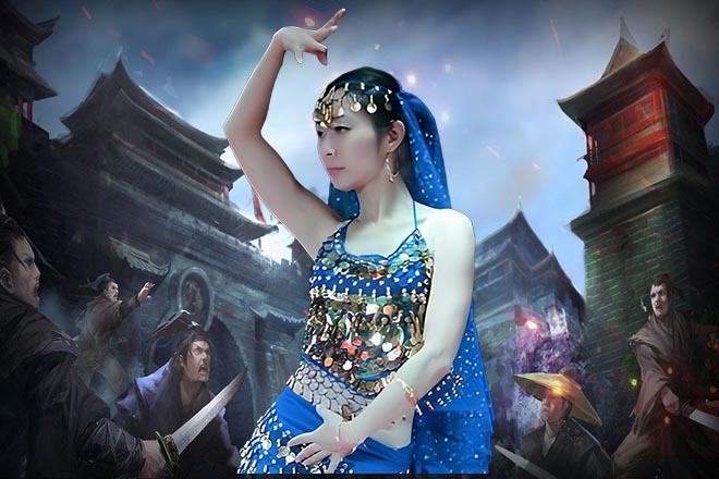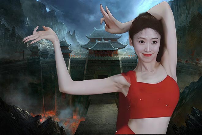 金光闪闪的镜子悬挂在大殿空中,对着VIP广场舞就是一道金光射下。