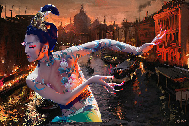 只见半空中五座山峰悬空而浮,山峰仙雾缭绕,在夕阳下折射出满目的霞光。五座山峰各有一白玉造成的长桥连着中间一处百余亩大小的平地。